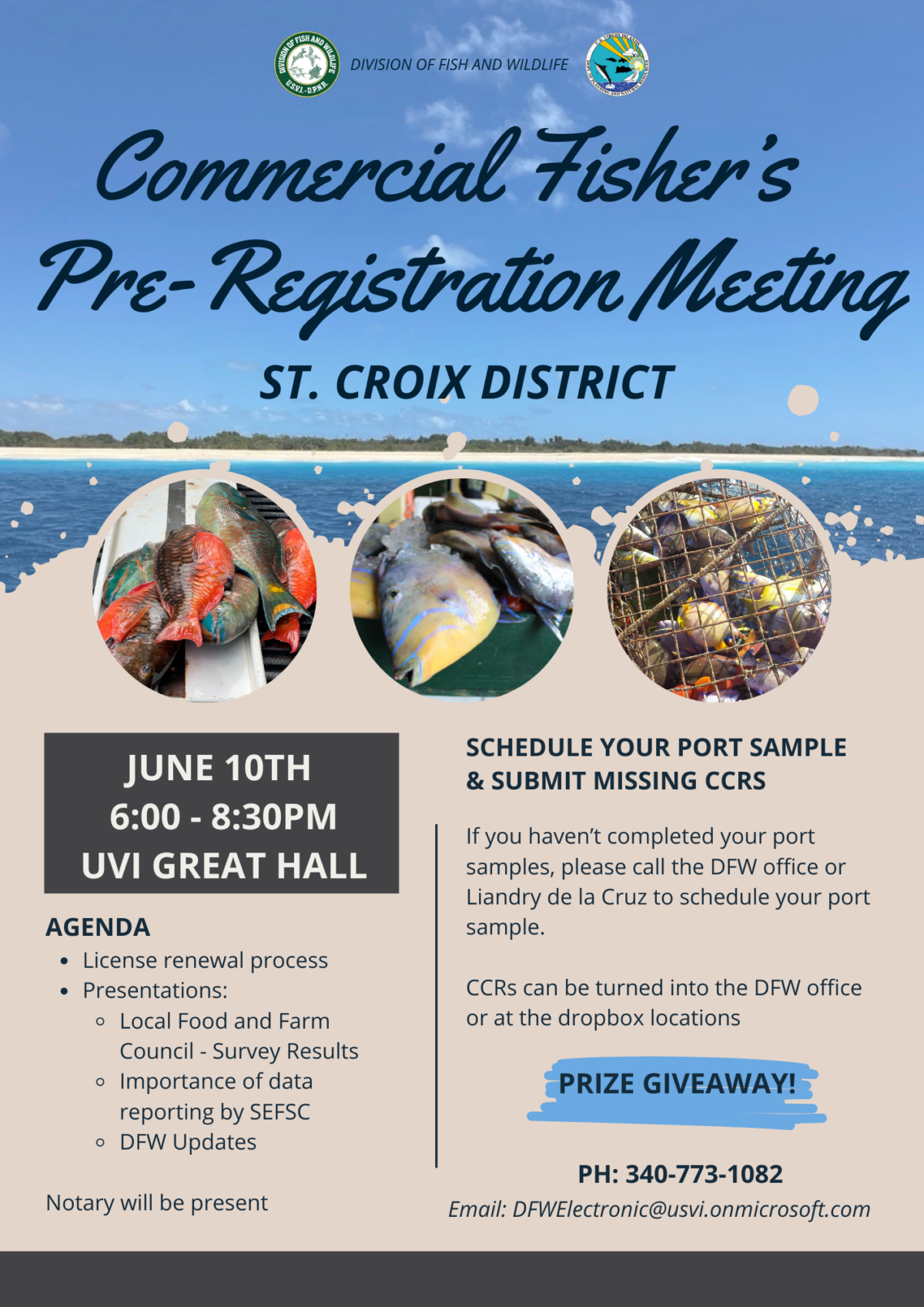 Commissioner Jean-Pierre L. Oriol of the Department of Planning and Natural Resources announces that the Division of Fish and Wildlife will hold Pre-Registration Meetings for all Virgin Islands commercial fishers.