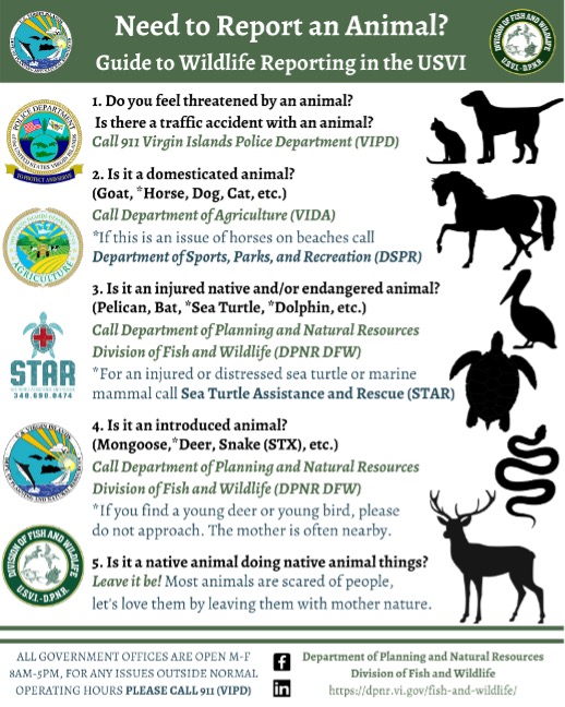 Are you having issues with wildlife? There are a couple ways to resolve your wildlife related conflict. Explore the wildlife interactions guide below to identify which agency can assist you. For non-life-threatening cases, you may report wildlife related conflicts through the DPNR hotline which can be found here or downloaded as a mobile application.